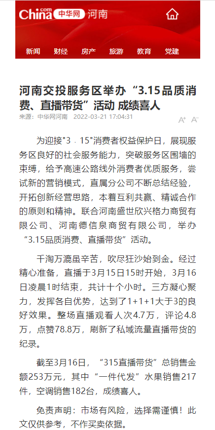 中華網(wǎng)、中原網(wǎng):河南交投服務(wù)區(qū)舉辦“3.15品質(zhì)消費(fèi)、直播帶貨”活動 成績喜人