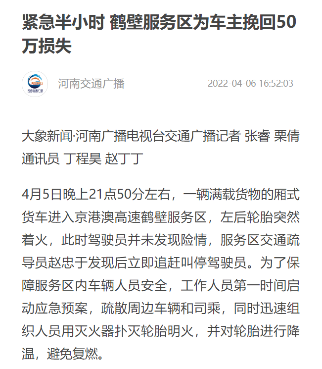 河南交通廣播:緊急半小時 鶴壁服務(wù)區(qū)為車主挽回50萬損失