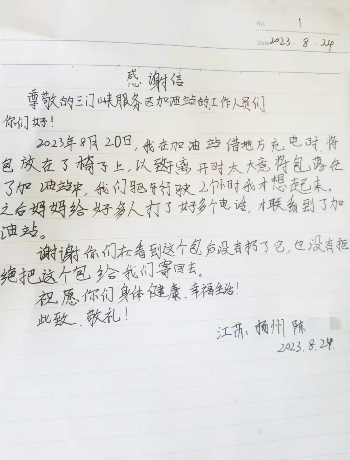 2023-08-28 作者:8月26日,三門峽服務區加油站收到了一封特殊的感謝信,這封信由一位江蘇省揚州市的小朋友親手書寫,表達了對加油站員工熱心幫助的誠摯謝意。原來在8月20日,一位司乘人員在三門峽服務區加油站加油時,隨行的小朋友來到便利店充電,臨走時不慎將裝有證件和若干現金的帆布挎包遺…