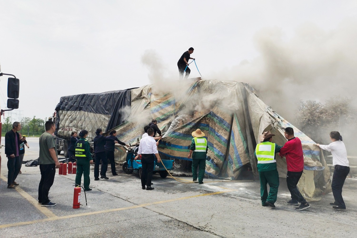 5月10日13:40左右,一輛滿載貨物的車輛冒著滾滾濃煙駛?cè)氚碴?yáng)服務(wù)區(qū),工作人員發(fā)現(xiàn)后立即將車輛引導(dǎo)至降溫加水處,同時(shí)啟動(dòng)消防應(yīng)急預(yù)案,一邊設(shè)立警戒隔離、維護(hù)現(xiàn)場(chǎng)秩序、疏散過往車輛人員,一邊用滅火器控制火勢(shì),用水管對(duì)冒煙部位進(jìn)行降溫滅火,及時(shí)有效控制火勢(shì)蔓延。20分鐘后,消防車趕到,最終在大家的共同努力下,火情被成功撲滅。