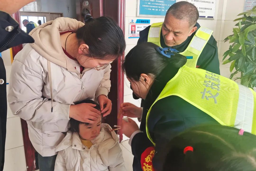 2月11日,項(xiàng)城服務(wù)區(qū)工作人員為頭部受傷小朋友涂抹碘伏 用創(chuàng)可貼包扎傷口